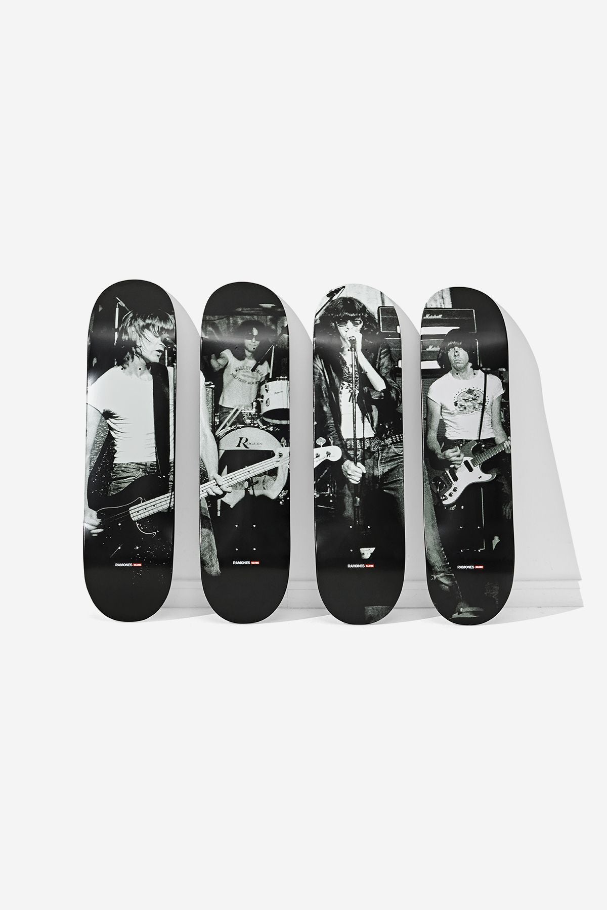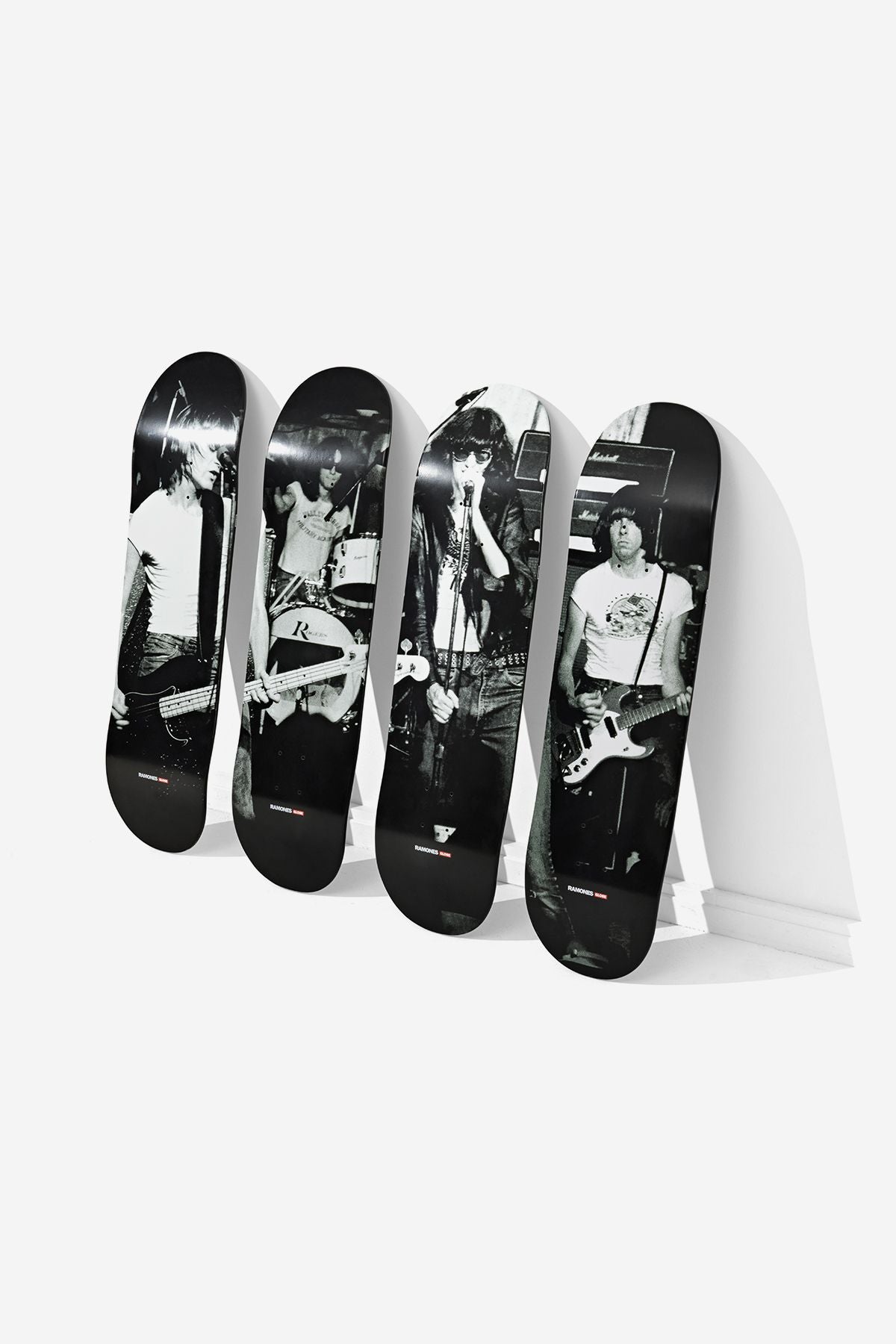 The Ramones Collector’s Set includes four limited edition 8.25″ decks, featuring Dee Dee, Tommy, Johnny and Joey Ramone mid-performance at CBGB’s in 1976, captured by photographer Bob Gruen. Decks are constructed from Resin-7 Canadian maple and come in an embossed and quilted carry case, inspired by the Ramones’ iconic black leather jackets. Display these boards, store them, hang them on your wall, or skate them. Whatever you choose to do, we hope you are as proud of them as we are.